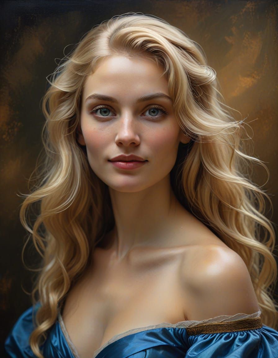 This image is a luminous oil painting portrait of a beautiful woman with flowing blonde hair and an off-the-shoulder blue gown, rendered with soft lighting and rich textures in a classical aesthetic.