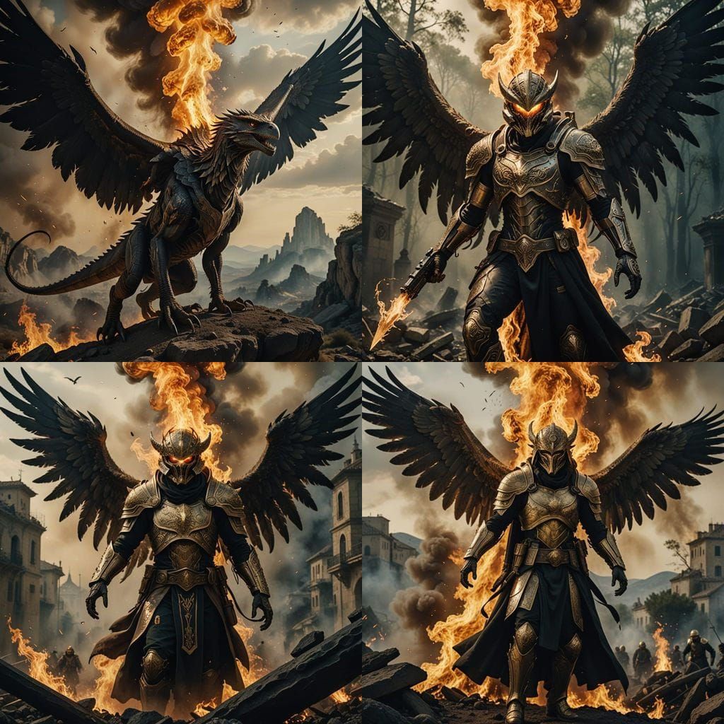 A dramatic cinematic still of an ancient dragon serpent accompanied by angels amidst smoke, fire, and falling hail. The image has a film grain and vignette effect with cinematic lighting.