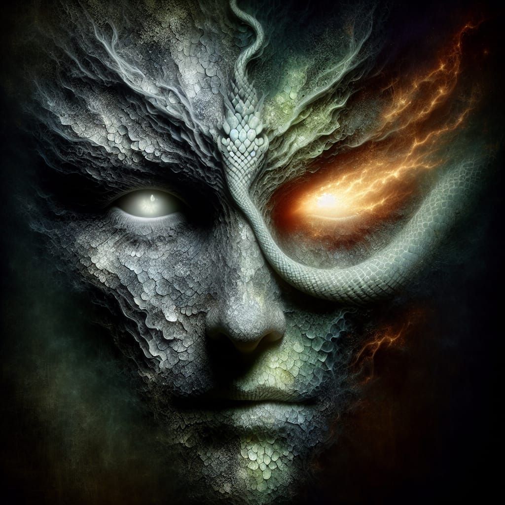A striking picture of a weathered mystic figure with heterochromatic glowing eyes. Reptilian skin textures and a serpent intertwine in a dark, shadowy background. The image uses a dark color palette to create a dramatic, transcendental effect.