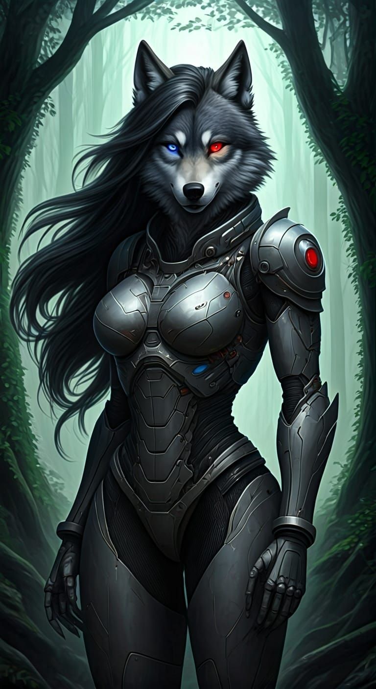A striking picture of a wolf-like humanoid female in futuristic power armor. She stands in a mystical forest with flowing black hair and heterochromatic eyes, rendered with bold lines and mechanical details.