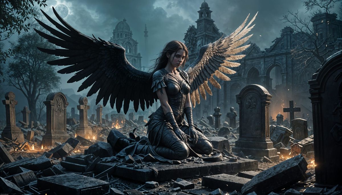 A poignant image of a fallen angel praying in silence amidst a ruined graveyard, surrounded by smoldering ruins and broken tombstones, under a stormy sky with a faint moonlight, evoking a sense of desolation and dark fantasy.