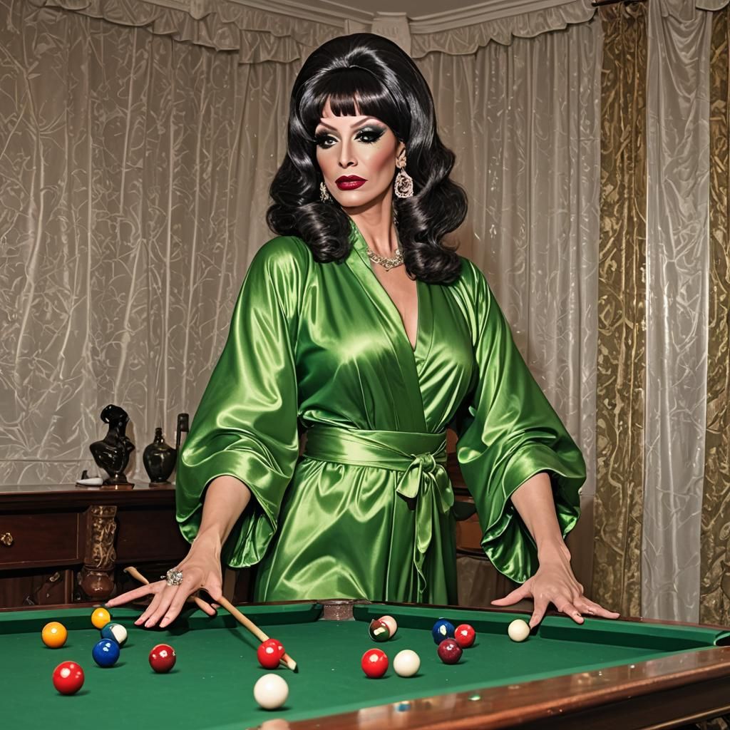 This image depicts a flamboyant drag queen in a green satin caftan playing snooker. The scene includes wigs, gloves, and makeup mirrors, capturing an ultra-feminine aesthetic.