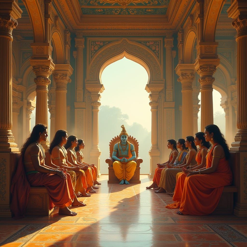 This image shows a lavish Indian palace interior scene. The Pandava brothers and their family are depicted in traditional attire, alongside Lord Krishna and Rishi Vedavyas, all bathed in warm, golden light.
