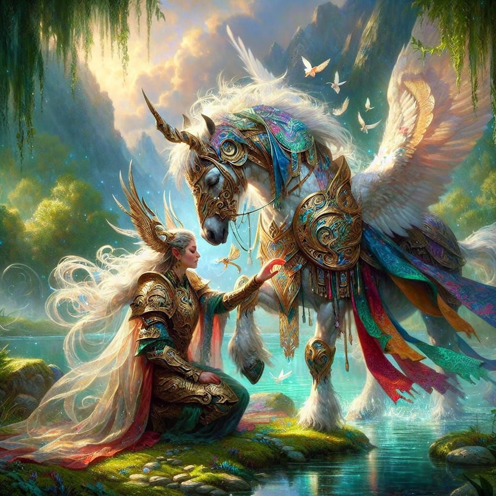 A highly detailed, 8k fantasy art painting, reminiscent of a scene that could be from a fantastical card game. The scene portrays a female warrior of Caucasian descent with long, flowing hair and complex armour, sharing a tender moment with a mythical creature that seems like a horse but with wings and ...