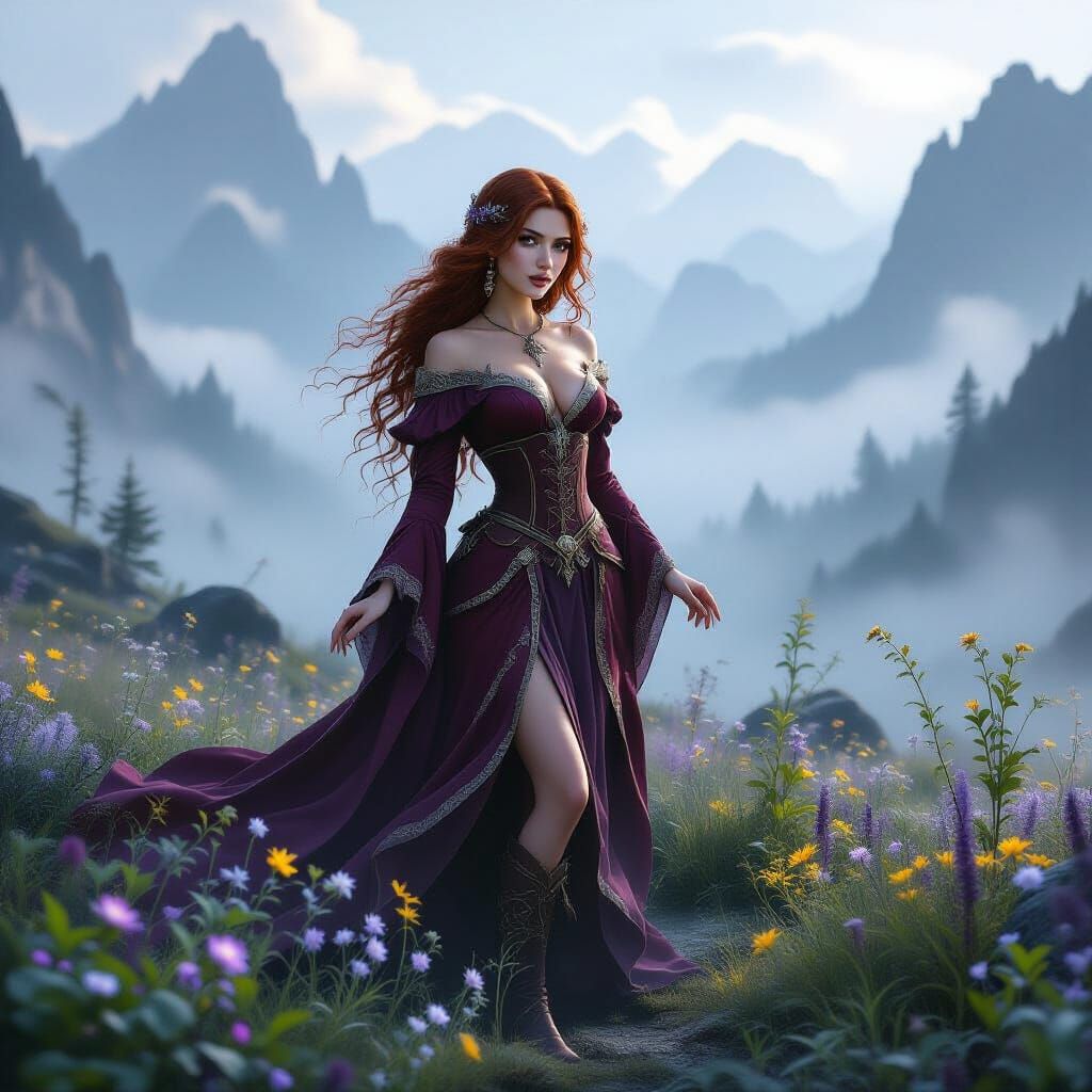 This image shows a beautiful mage with crimson hair standing in a misty meadow surrounded by magical herbs. Ancient mountains rise in the background, enhancing the serene, enchanted atmosphere of this high fantasy scene.