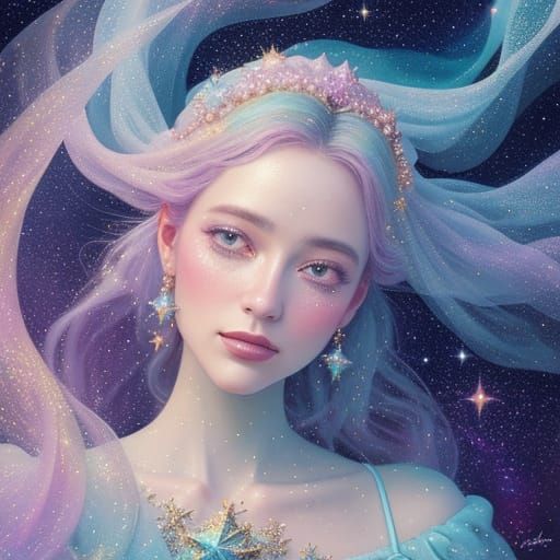 A portrait of a woman in a stardust dress. The image evokes a dreamy and mystical atmosphere. The artwork is rendered in a vibrant oil painting style with a soft, ethereal glow.