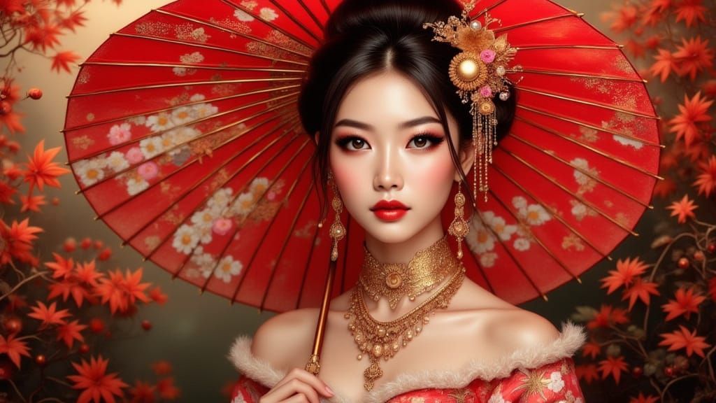 <lora:Asian:1.0> <lora:Whimsical:1.0> <lora:Cute Anime:1.0> Young Asian woman, 20s, in traditional Japanese kimono. Red and white floral kimono, off-the-shoulder design, with elaborate gold jewelry. Elegant and intricate floral patterns adorn the kimono. Woman's hair styled in a traditional Japanese ...