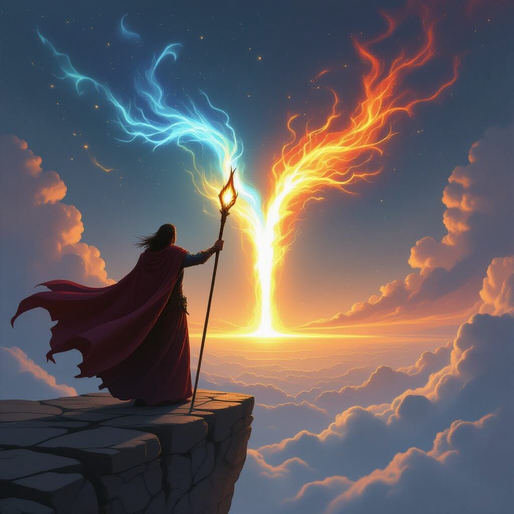 This epic fantasy image shows a figure on a high ledge holding two staffs, one glowing gold, the other aflame, facing a rift of possibilities. Dramatic lighting and vivid colors enhance the scene.