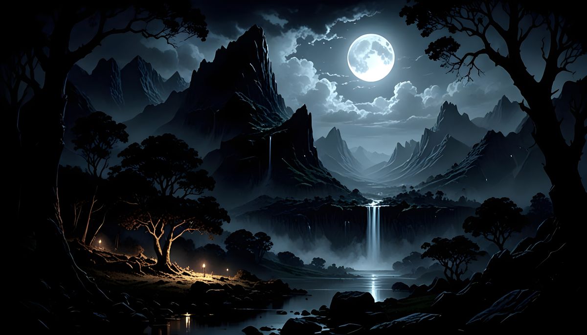 This detailed matte painting depicts a nocturnal mountain valley with a cascading waterfall. A full moon shines from behind the mountains in a sinister, horror-inspired oil painting style.