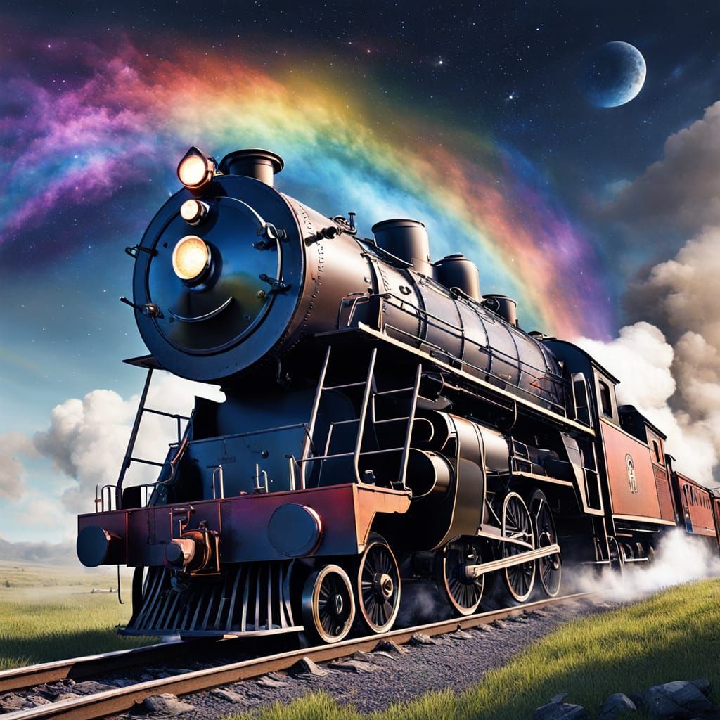 A stunning digital art piece depicting a train steaming through a vibrant, rainbow-colored galaxy, with swirling clouds of colorful gas and stars.