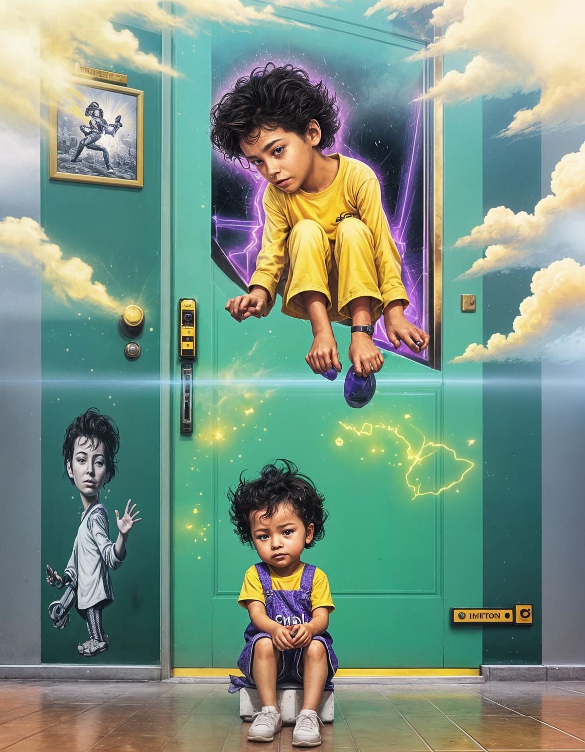 This image depicts a fantastical scene with a young man, Ridley, surrounded by glowing neon lights and a sense of infinity. The artwork features a unique blend of modern art and fantasy elements, with a vibrant yellow and purple color palette.