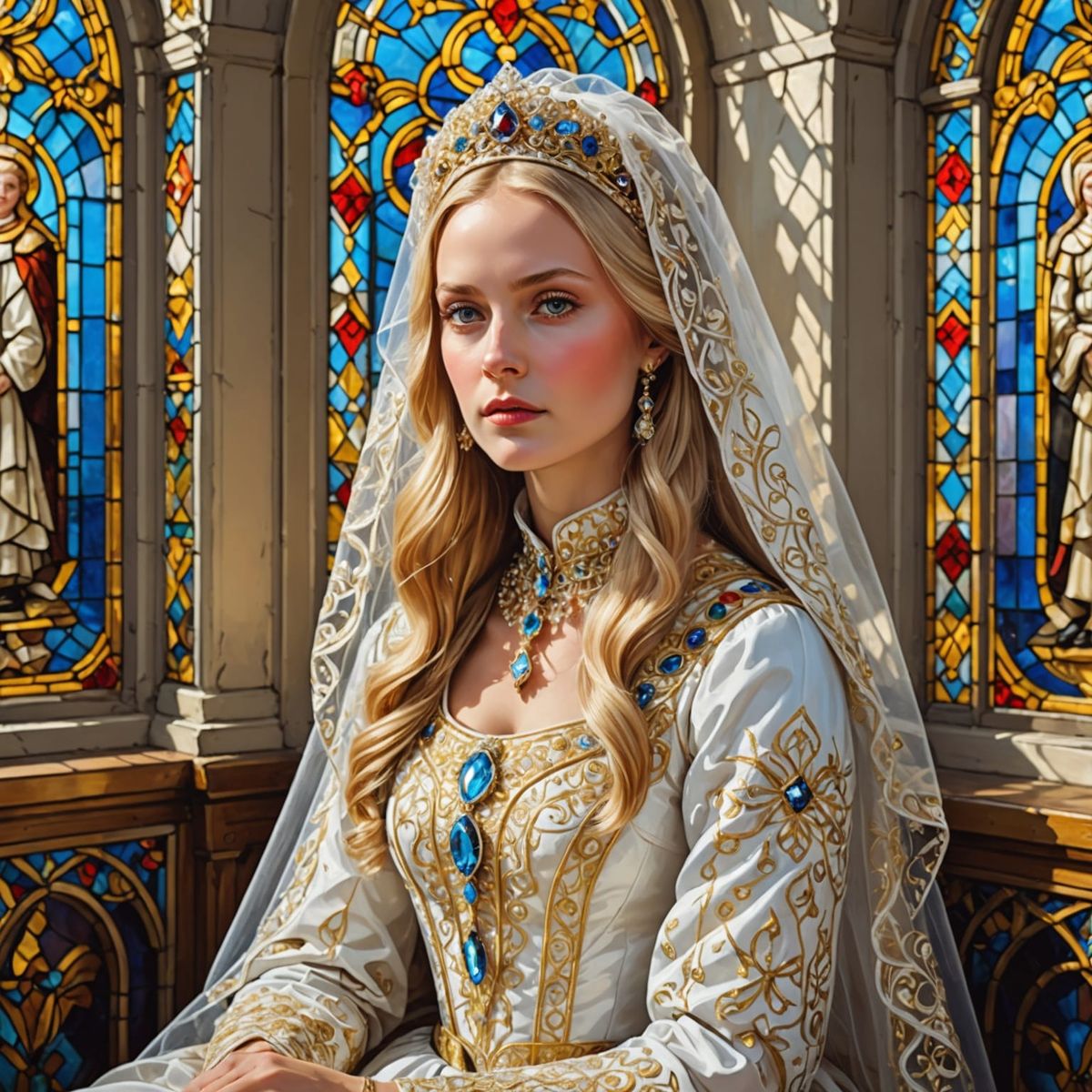 A stunning portrait of a young Tsarina Alexandra in traditional dress. The image features volumetric lighting and stained glass in the style of golden age painting.