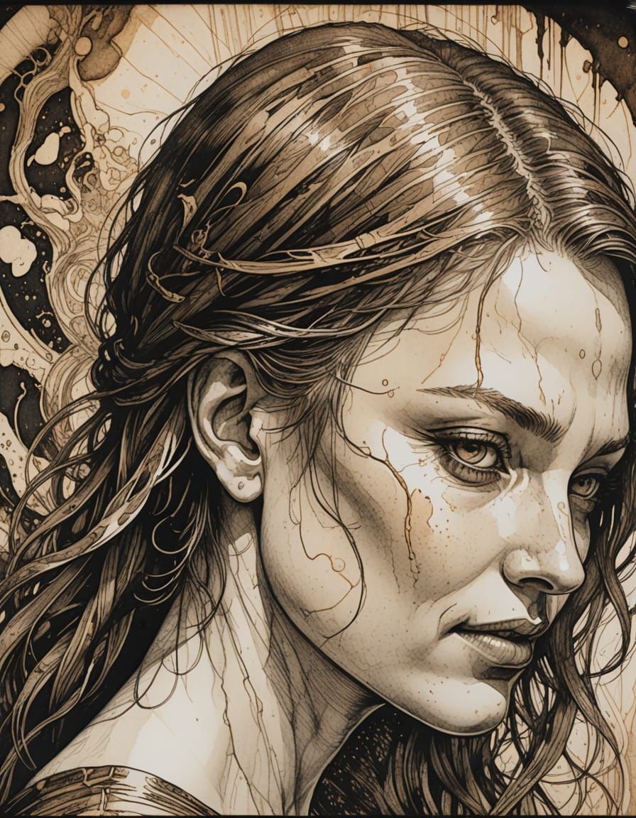 A captivating etching of a young girl with a mischievous grin, set against a warm, golden background with atmospheric fog and dramatic chiaroscuro lighting. Inspired by the intense lines of Albrecht Durer, this piece features bold shading, high contrast, and vibrant earth tones.