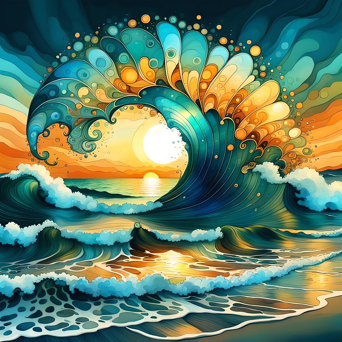 A vibrant sunset over a sandy beach with crystal clear ocean. This artwork uses watercolor techniques, with abstract fractal and zentangle influences to create a colorful scene.