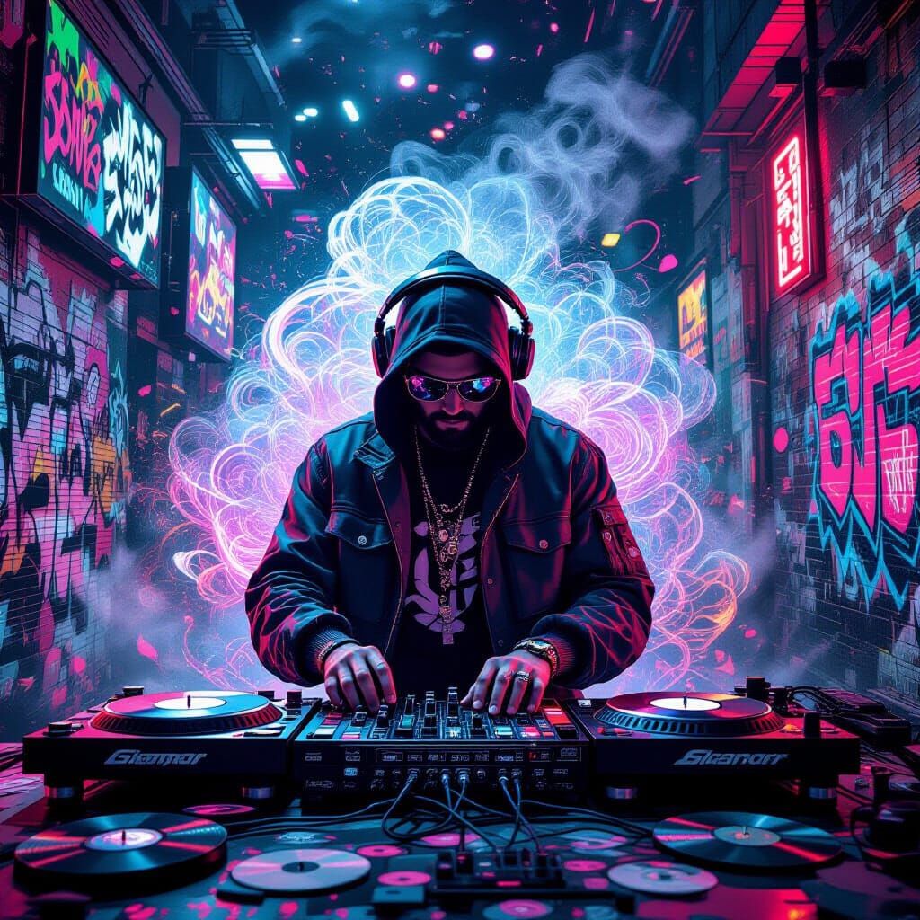 This image shows a DJ immersed in their craft amidst vintage equipment and vinyl records. Digital glitch patterns and graffiti art combine in a hyperrealistic style to create a colorful and high-contrast atmosphere.