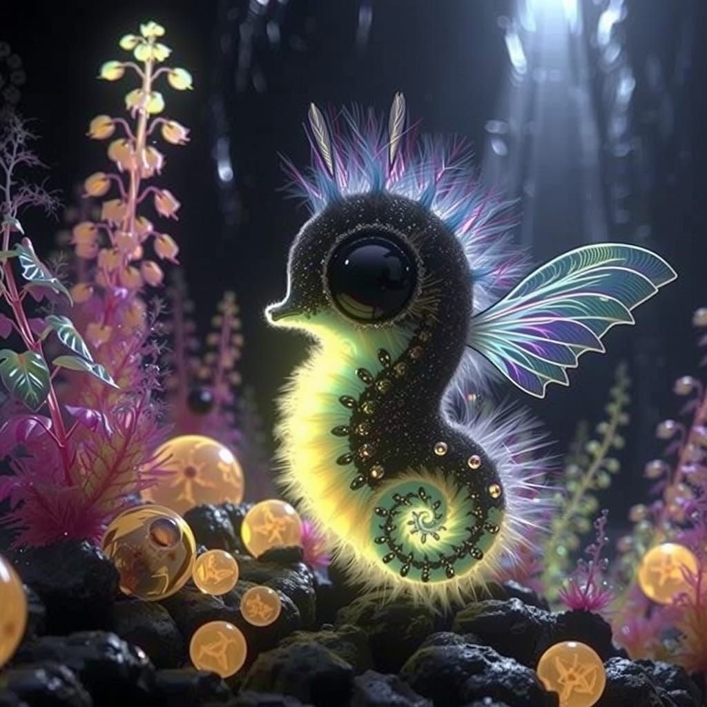 A vibrant image of a miniature rainbow seahorse with wings perched on glowing plants. The scene, set in a dark crystal cave, showcases alien flora with a luminous, ethereal aesthetic.