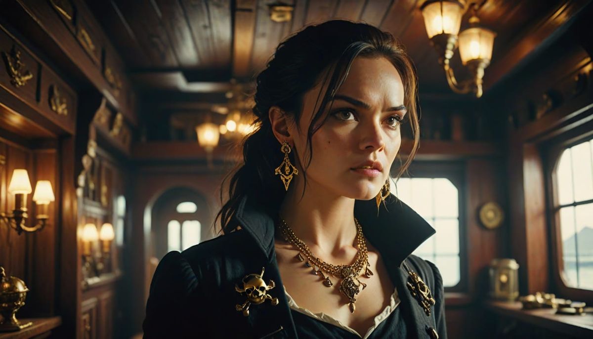 A cinematic shot of a female assassin in a pirate captain's cabin, holding daggers. She wears gold earrings and a diamond necklace in soft, warm lighting, with rich, vivid colors, as a film still.
