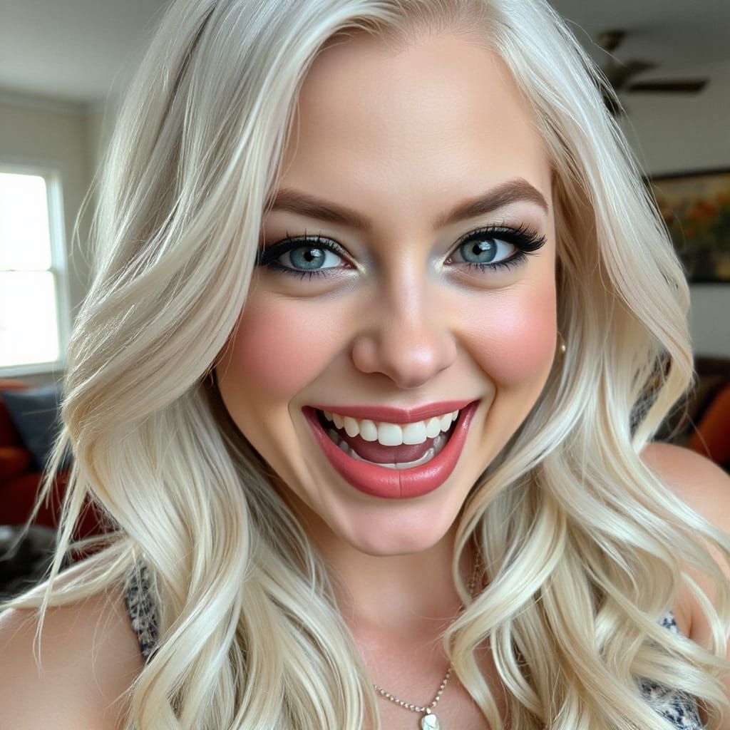 This image shows a hyperdetailed 8K portrait of a smiling albino woman. The style evokes a 1990s aesthetic.