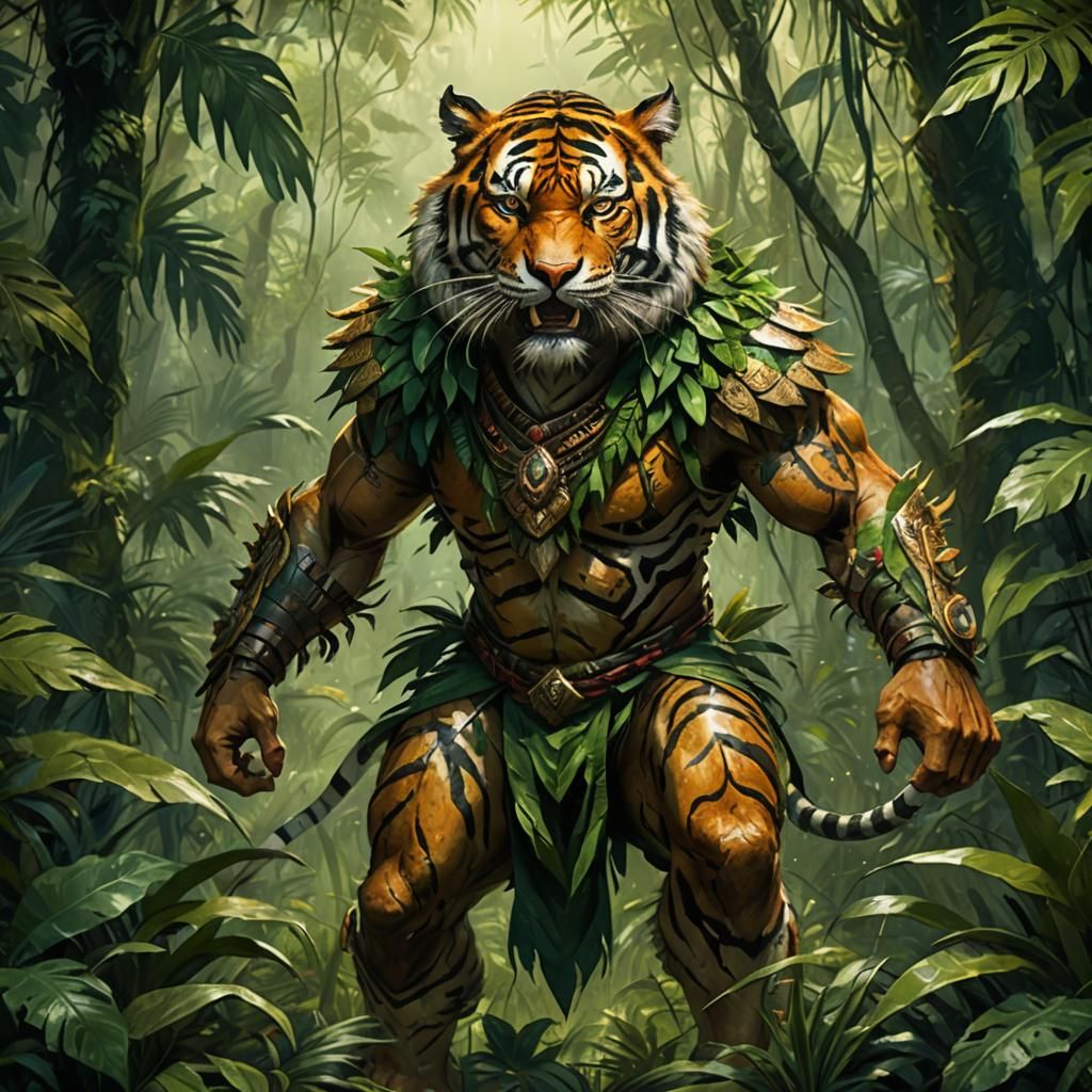 This image shows a fierce tiger-humanoid warrior standing in a jungle. The character has tiger fur, sharp teeth, and glowing eyes, rendered with high contrast and painterly brushstrokes.