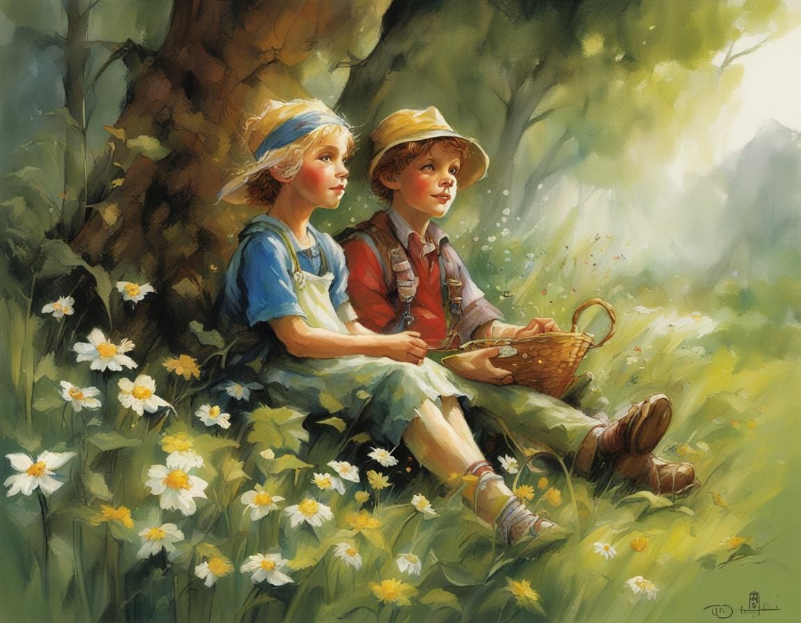 This image shows a vibrant natural landscape with a rainy sky. The artwork evokes a fantasy illustration style with lush details and a painterly aesthetic.