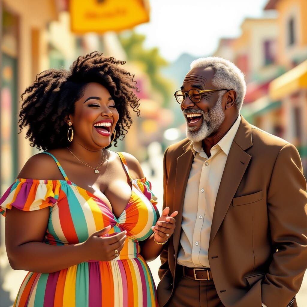 This image shows a joyful moment between a woman and an elderly man, influenced by comic art styles. The scene is brought to life with bold lines and expressive details in a warm, sunny atmosphere.