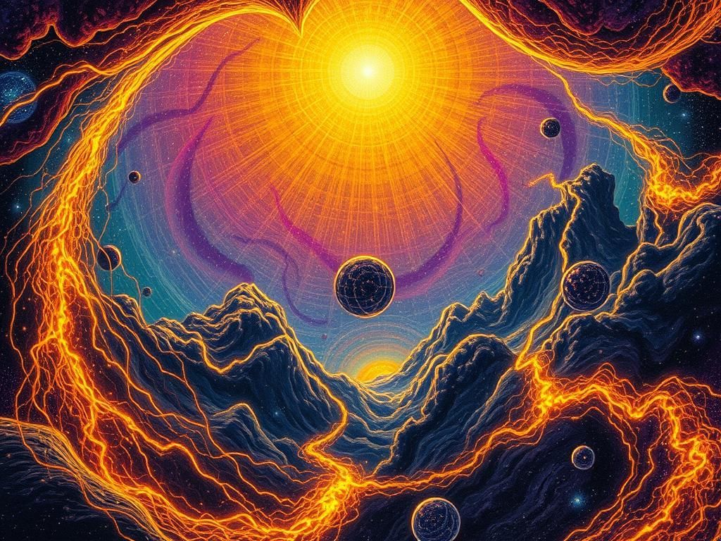 A vibrant, psychedelic dreamscape featuring a cosmic vortex. The image radiates golden light, reminiscent of the vivid and surreal styles found in contemporary psychedelic art.