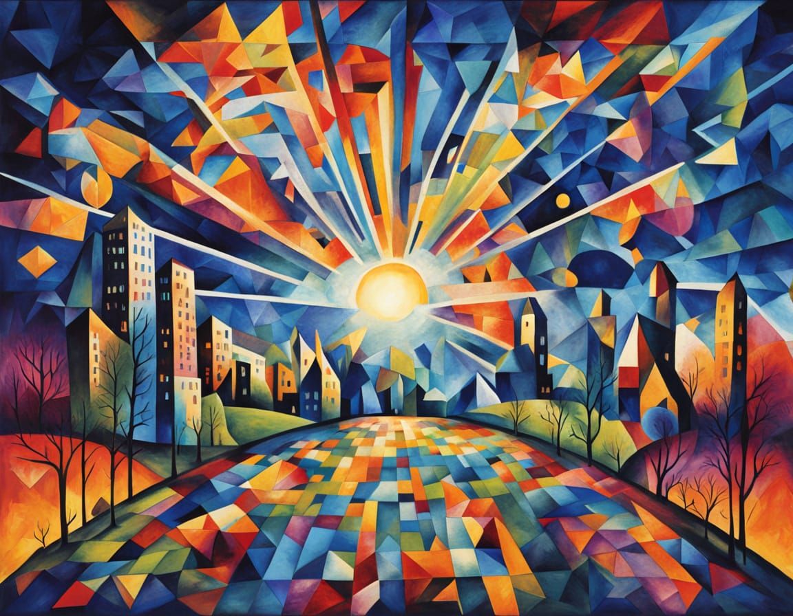 Surreal cityscape. Medium shot. A city made of colorful prisms. Cubist art style. Vibrant geometric shapes and bioluminescent creatures. Iridescent textures and expressive brushstrokes. Cosmic lighting with swirling nebulae. Paul Klee and Piet Mondrian inspired. Dreamlike. Richly detailed. Vibrant colors. ...