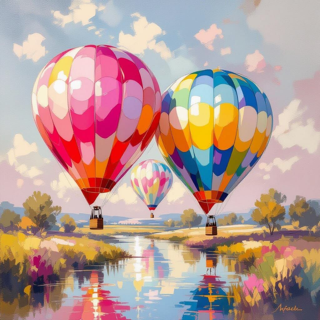 A vibrant impressionistic painting of hot air balloons in flight. The artwork features radiant colors and shimmering gold accents, with soft brushwork creating a dreamlike and luminous atmosphere.