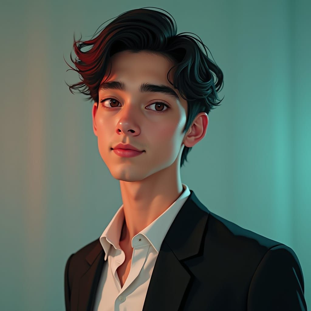 This image shows a young man with dark hair wearing a black blazer and white shirt. The portrait features realistic rendering and subtle cinematic lighting with an aqua and red color scheme.