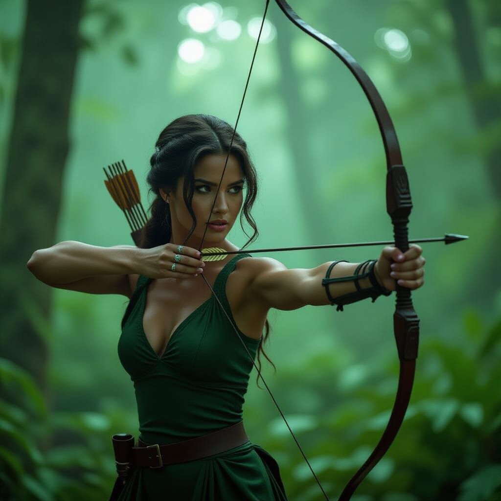 This image shows a dark-skinned woman in green clothing holding a bow. She is set in a lush forest with cinematic lighting and film grain, creating an atmospheric depth reminiscent of film photography.