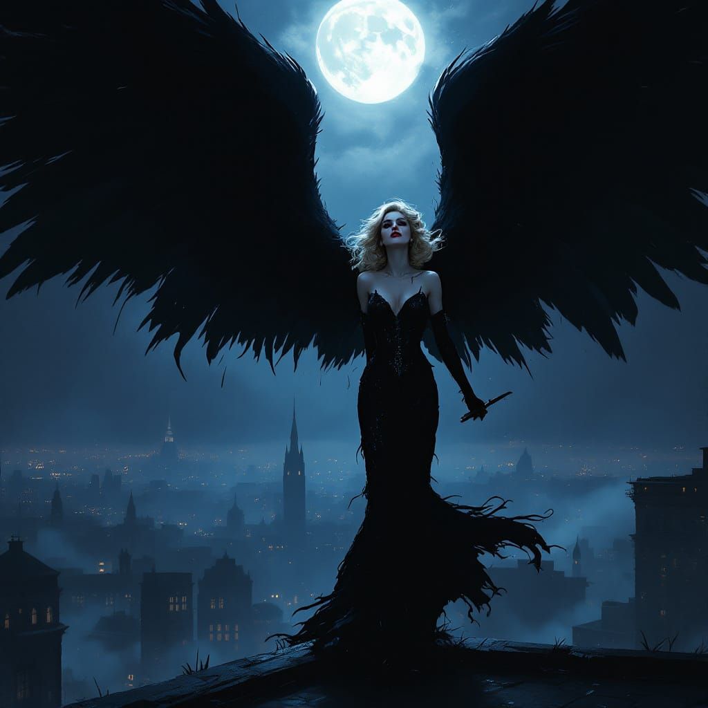 This painterly digital illustration captures a magnificent and terrifying villain on a rooftop, lit by moonlight. Concept art style with film noir influence and visible textured brushwork.