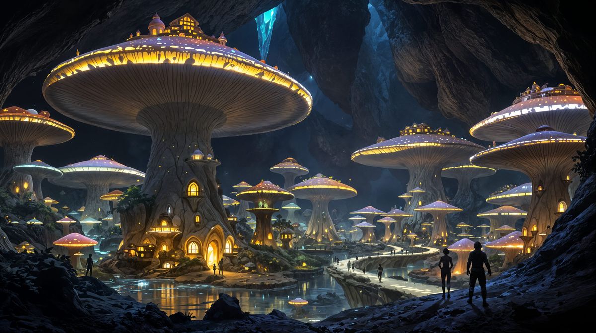 This image depicts a subterranean city built within and around towering, bioluminescent mushrooms. Glowing pathways and bridges connect the dwellings, while small, humanoid figures go about their daily lives amidst the mystical fungal landscape.