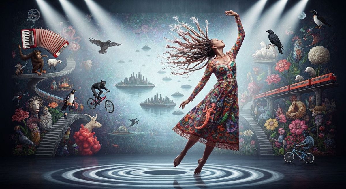 This image shows a dancer in a dress of embroidered lace, caught in a moment of transformation. The image combines psychedelic art with high contrast and energetic movement, creating a vibrant and surreal scene.