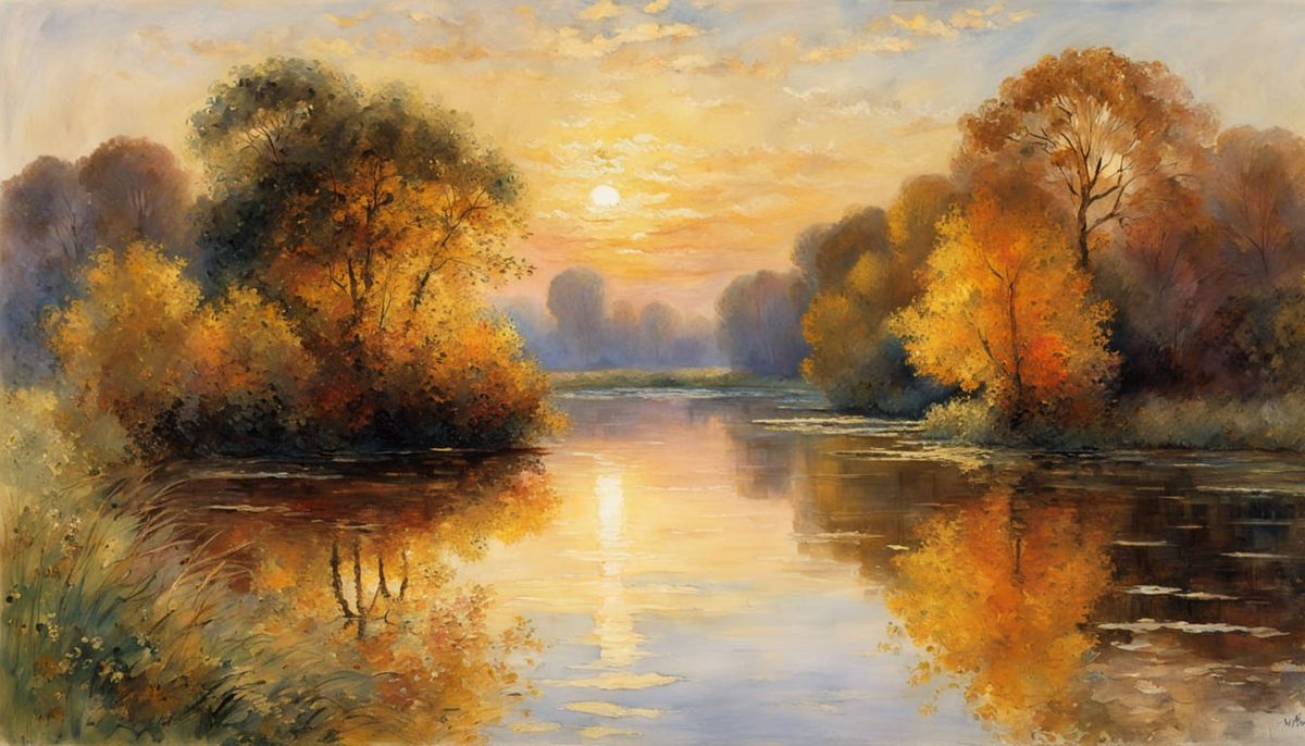 A watercolor and pen illustration of a sunset over a river. Autumn colors reflect in the water under warm golden light, creating a dreamy, ethereal atmosphere. Expressed with loose, delicate strokes.