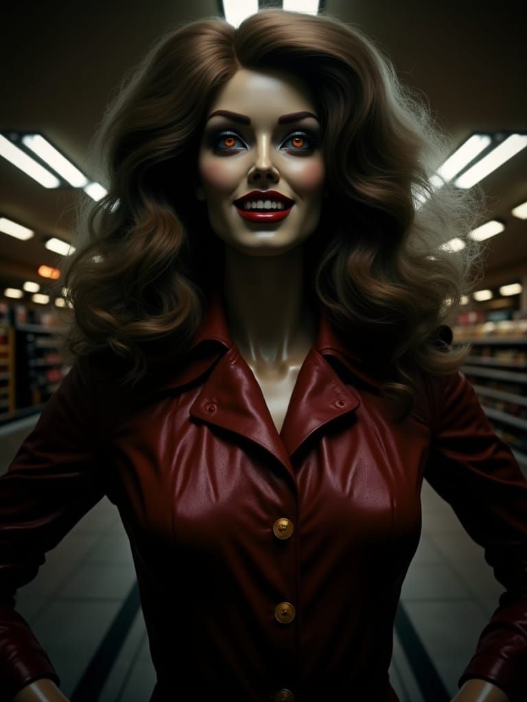 This image shows a terrifying female mannequin in retro clothing, posed in a vintage department store. Hyper-realistic textures and cinematic lighting enhance the scene's horror and nostalgia, with a hint of surreal horror.