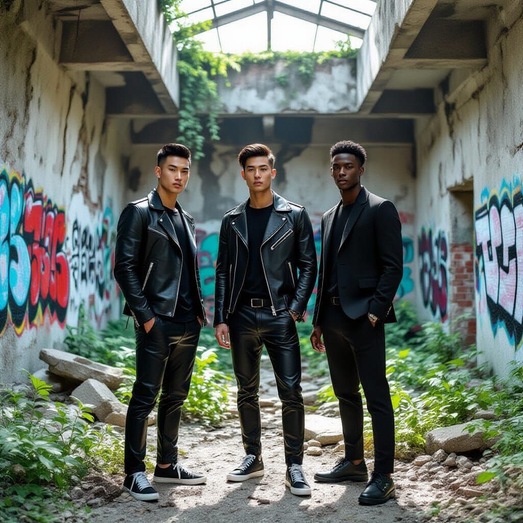 They stand like a chord struck clean: three notes of confidence in a city of echoes. The air smells of dust and rebellion, of walls that remember voices and nights. Leather and shadow sculpt their presence, a language without words, smooth and deliberate. They are not posing : they are claiming space, rewriting the code of cool with quiet defiance. Each jacket gleams like thought polished by experience; each gaze holds its own horizon. The ruin around them becomes a stage, and style, a kind of resilience. I love the stillness between them : that unspoken brotherhood that turns fashion into statement, and attitude into art. Have a very nice day, Zahadum !