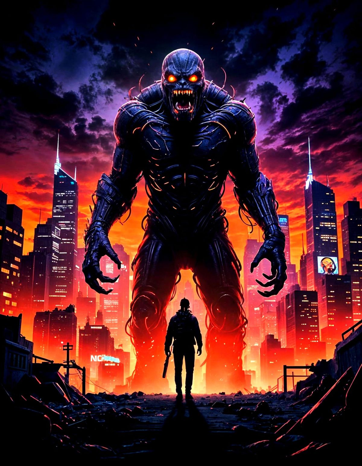 A striking image of a glowing-eyed monster dominating a vibrant cityscape at dusk, amidst terrified silhouettes of fleeing citizens and a distressed title