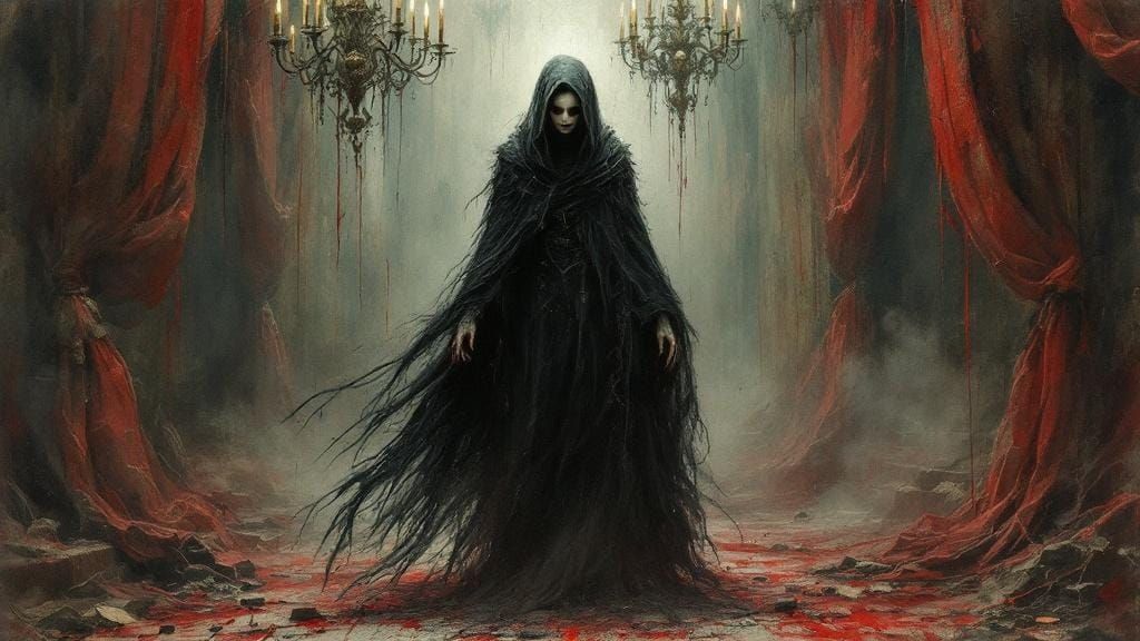 A somber figure in a cloak stands in a dilapidated masquerade. The image has watercolor expressionist textures and muted colors, evoking a sense of gothic horror and decay.