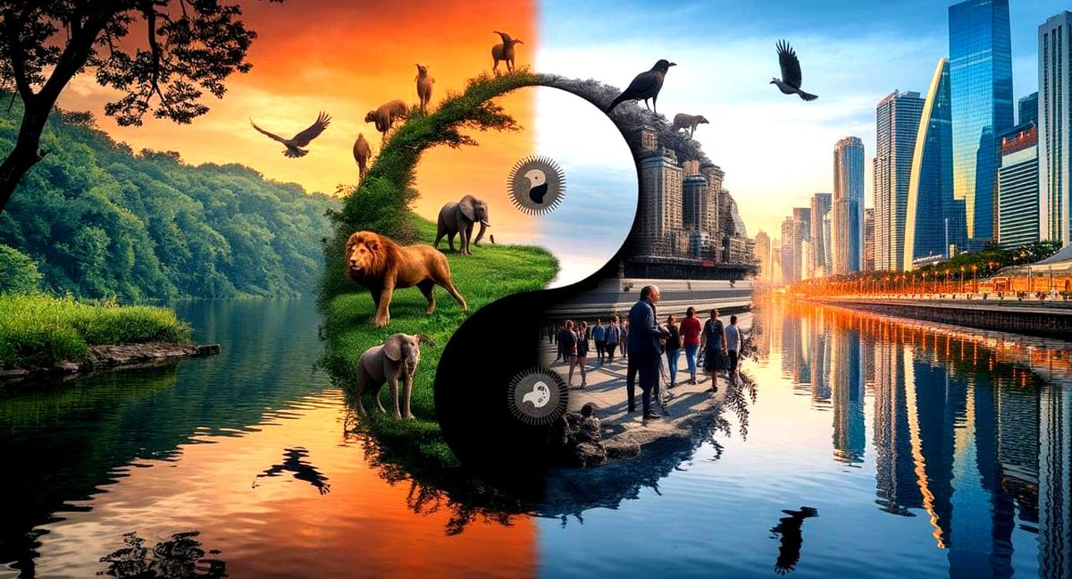 This image shows a yin and yang symbol, split between vibrant wildlife and a busy cityscape. The panoramic composition uses contrasting colors and cinematic lighting to emphasize the balance of nature and humanity.