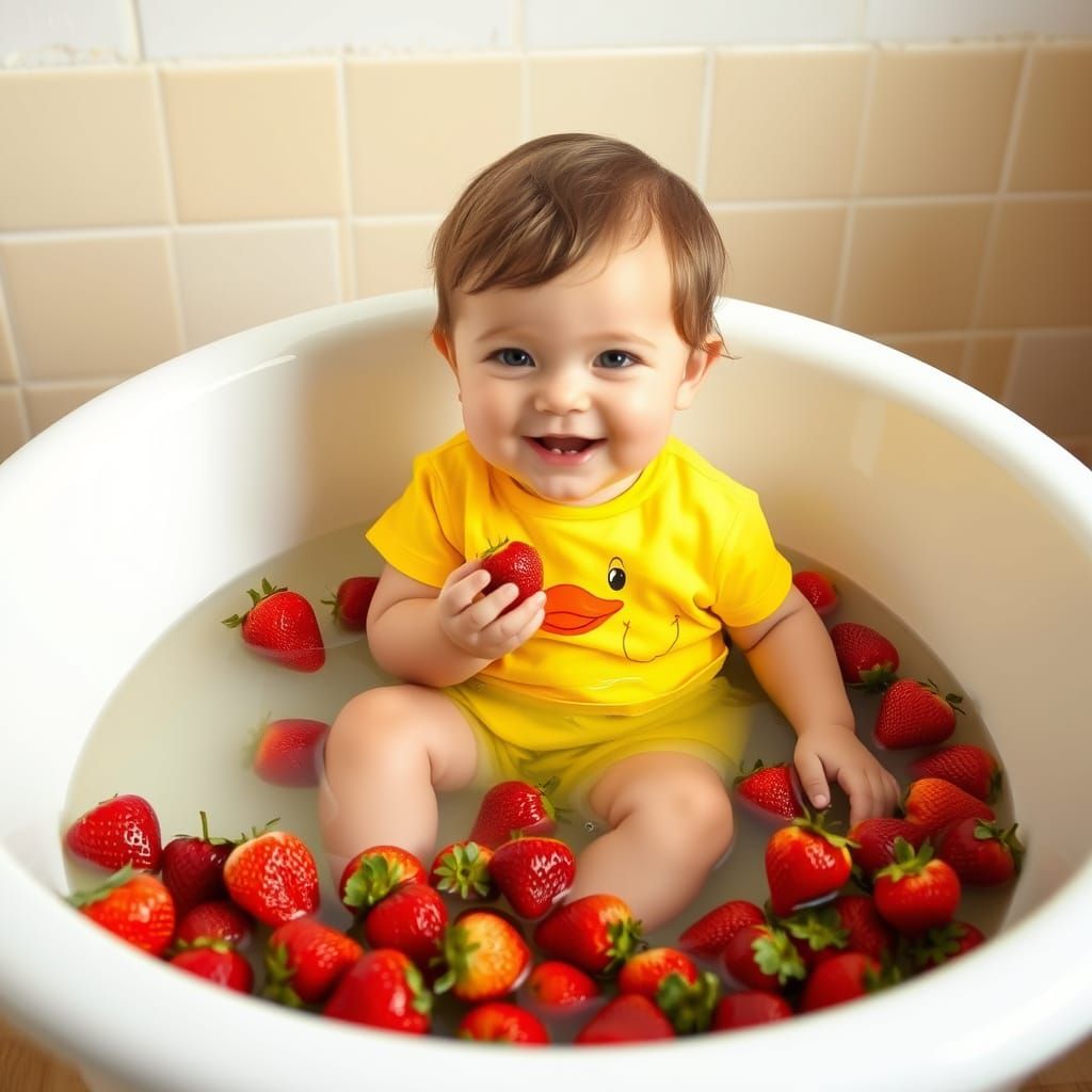 This image shows a happy child in a bathtub full of strawberries. The child, wearing a yellow ducky shirt, is about to eat a berry in a style reminiscent of vibrant pop surrealism.