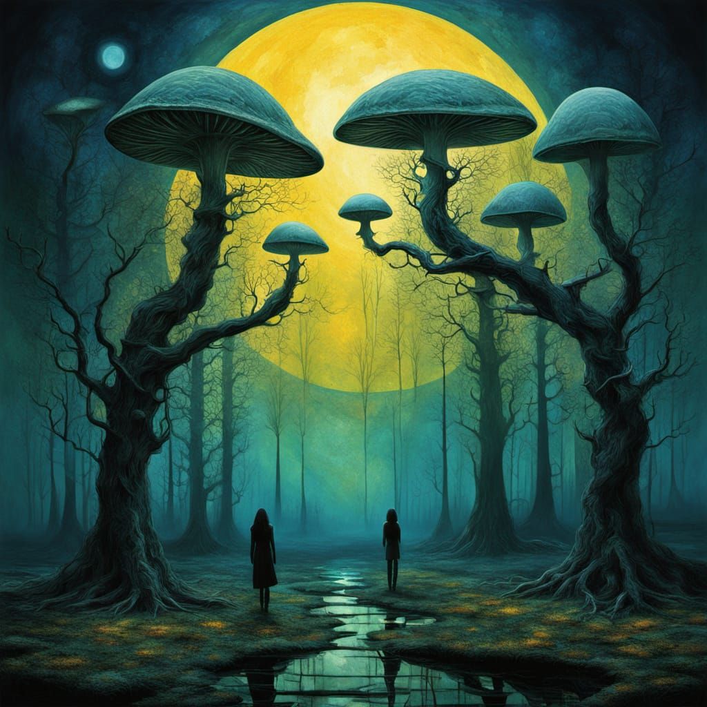 This surreal image depicts two women standing in a mystical landscape, surrounded by twisted trees, glowing mushrooms, and shards of blue glass. The dreamlike atmosphere is illuminated by a misty, moonlit glow, with vibrant and eerie colors emanating from the mosaic tiles reflecting in their dark eyes.