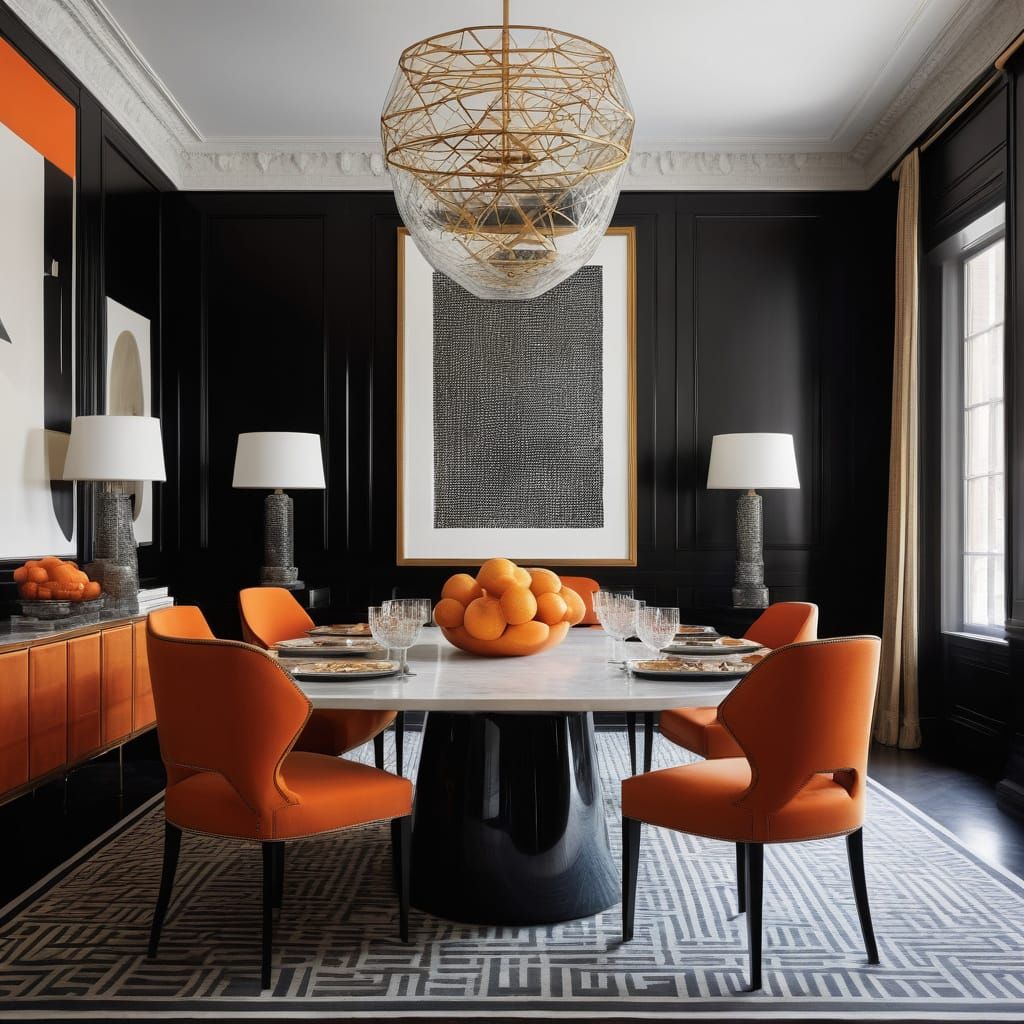 This image showcases a beautifully designed dining room with contemporary orange planned joinwork, exuding an elegant atmosphere and exquisite textures. Featuring warm tones, sleek lines, and a masterful blend of natural lighting and bokeh, this high-end interior design scene is reminiscent of upscale li...
