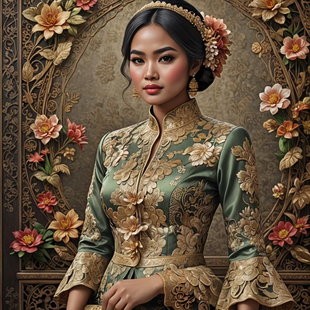 This image shows a hyperrealistic portrait of a young Indonesian woman in traditional Kebaya dress. The image is rendered in high definition with sharp detail.