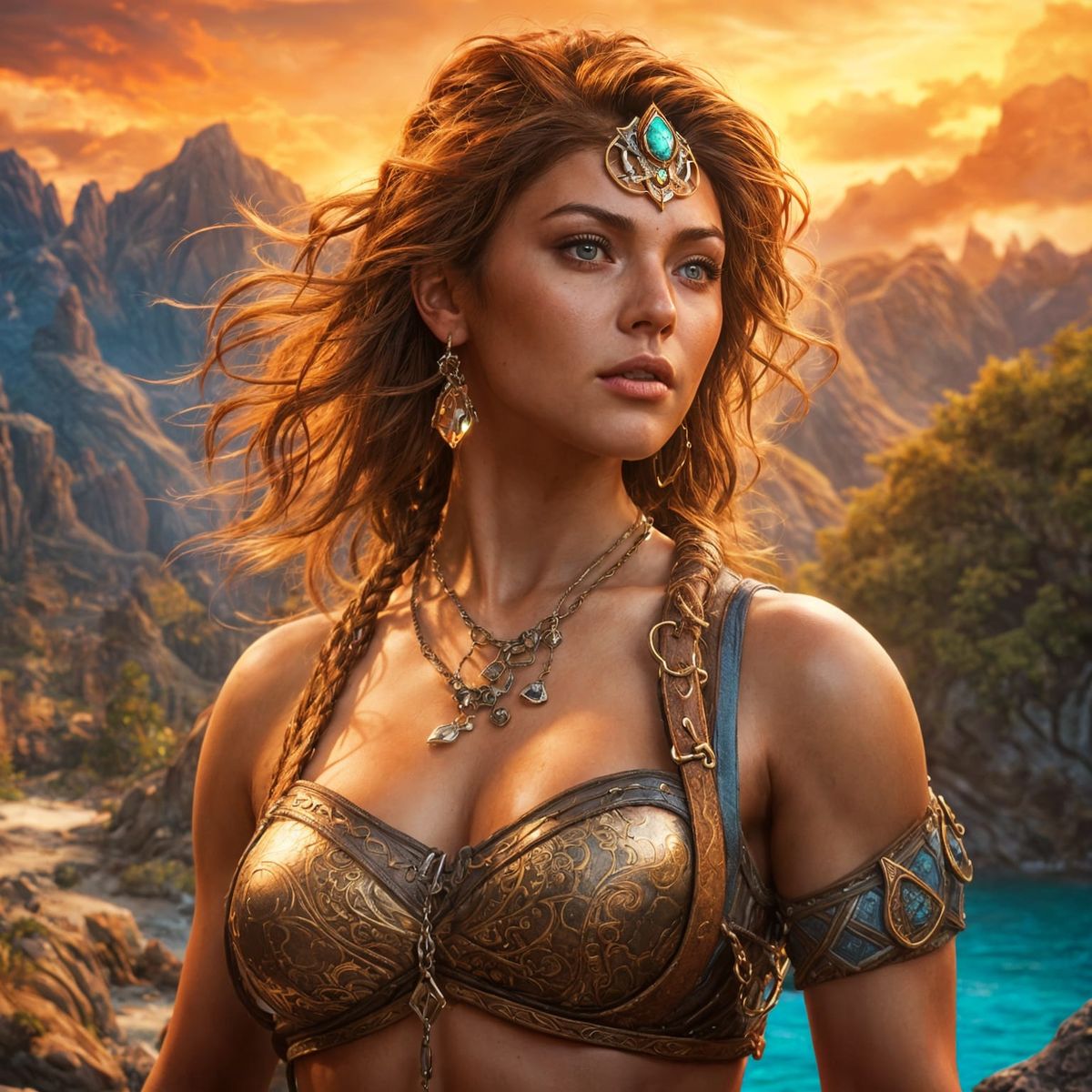 This image shows a sensual female barbarian in a high fantasy setting. The shirtless warrior with muscular curves stands against a scenic background, rendered with dynamic lighting in a hyperdetailed style.