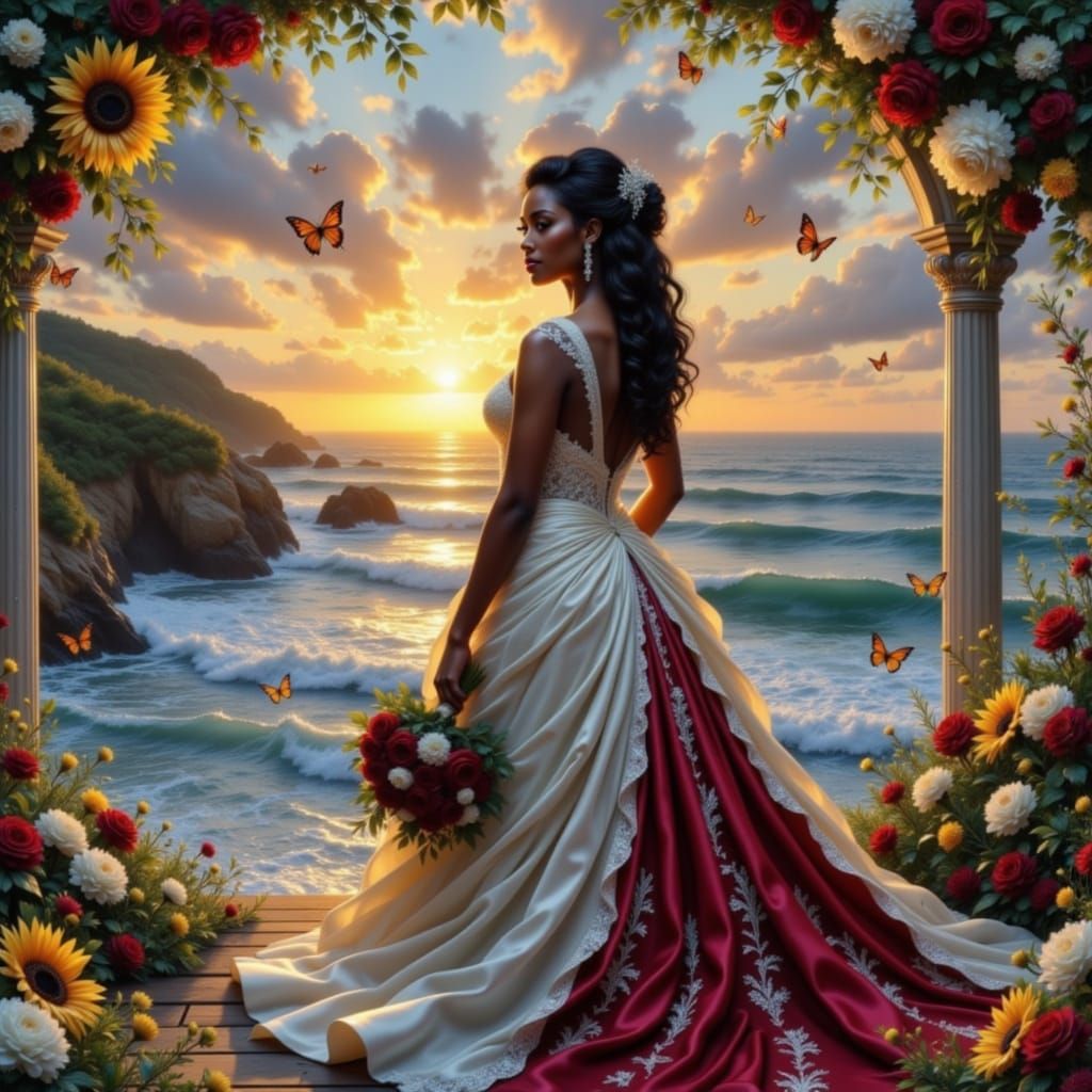 A stunning image of an African American bride on her wedding day, featuring a dark red and creme satin and velvet dress. The scene is set by an ocean cliff at twilight, with luminous butterflies and a vibrant sunset.