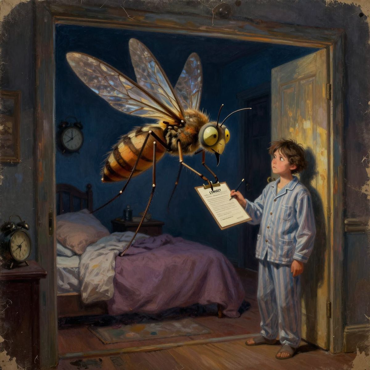 This image depicts a darkly whimsical, aged storybook illustration of a large, anthropomorphic mosquito offering a consent form to a confused human. The mosquito appears professional and polite.