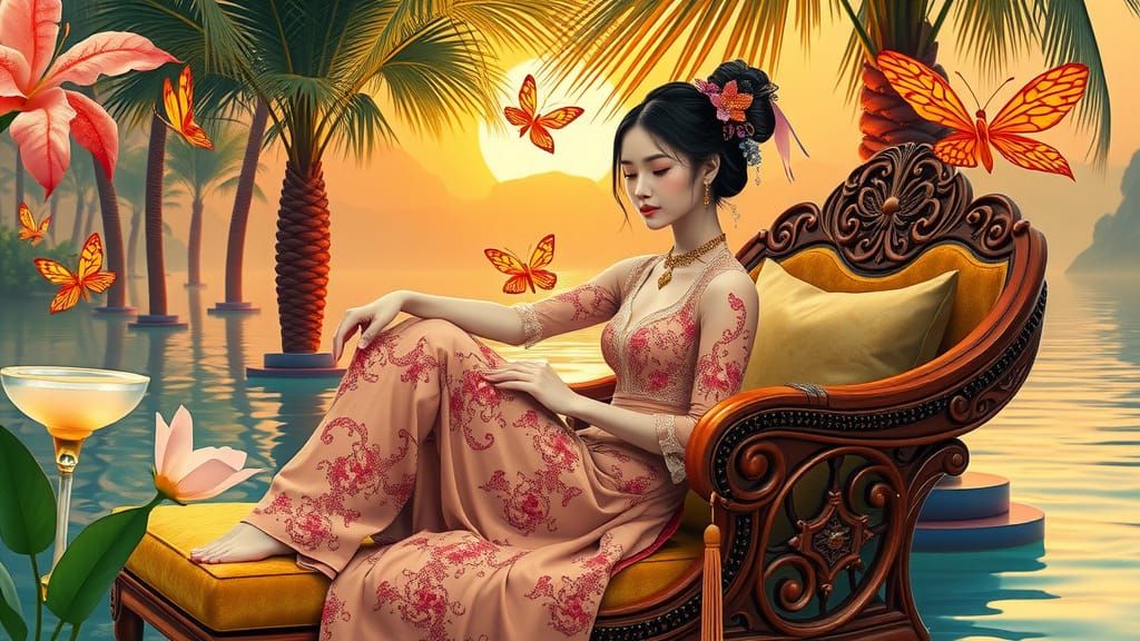 This image depicts a tranquil young Asian woman in a lush, dreamlike oasis, surrounded by vibrant flowers and ornate decor, exuding elegance and enchantment.