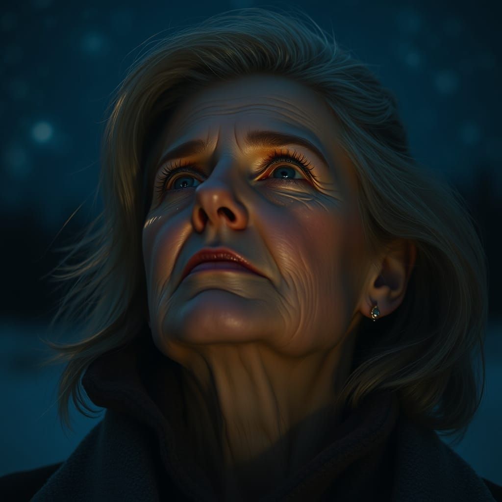 This image shows a serene, hyperrealistic portrait of a woman lost in thought, gazing up at the star-filled night sky, with a soft glow on her face and tears in her eyes, set against a dark outdoor backdrop.