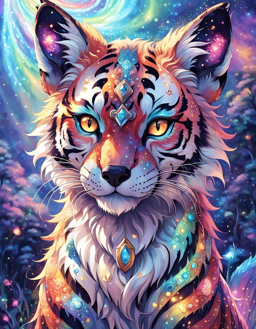 This image shows a whimsical fox-tiger hybrid with shimmering, holographic fur in a magical clearing. Ethereal lighting and celestial patterns create a vibrant, rainbow-colored scene.