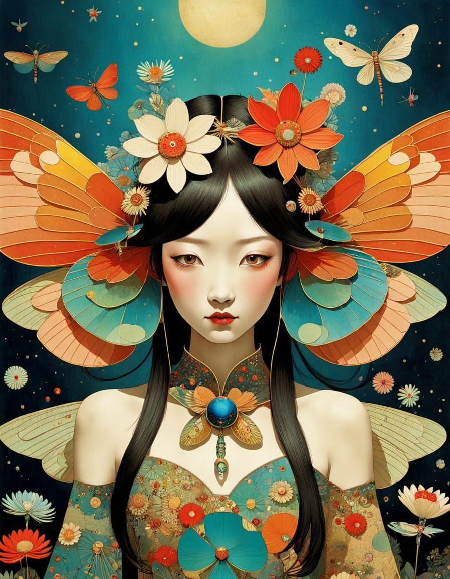 Takashi Murakami Vibrant Colors immersion, Retro Revival, Superimposed Spiritual/Cosmic Flower Fairy with Dragonfly wings (Full-body:1.4) Geometric Abstraction, Victo Ngai, Catrin Welz-Stein
